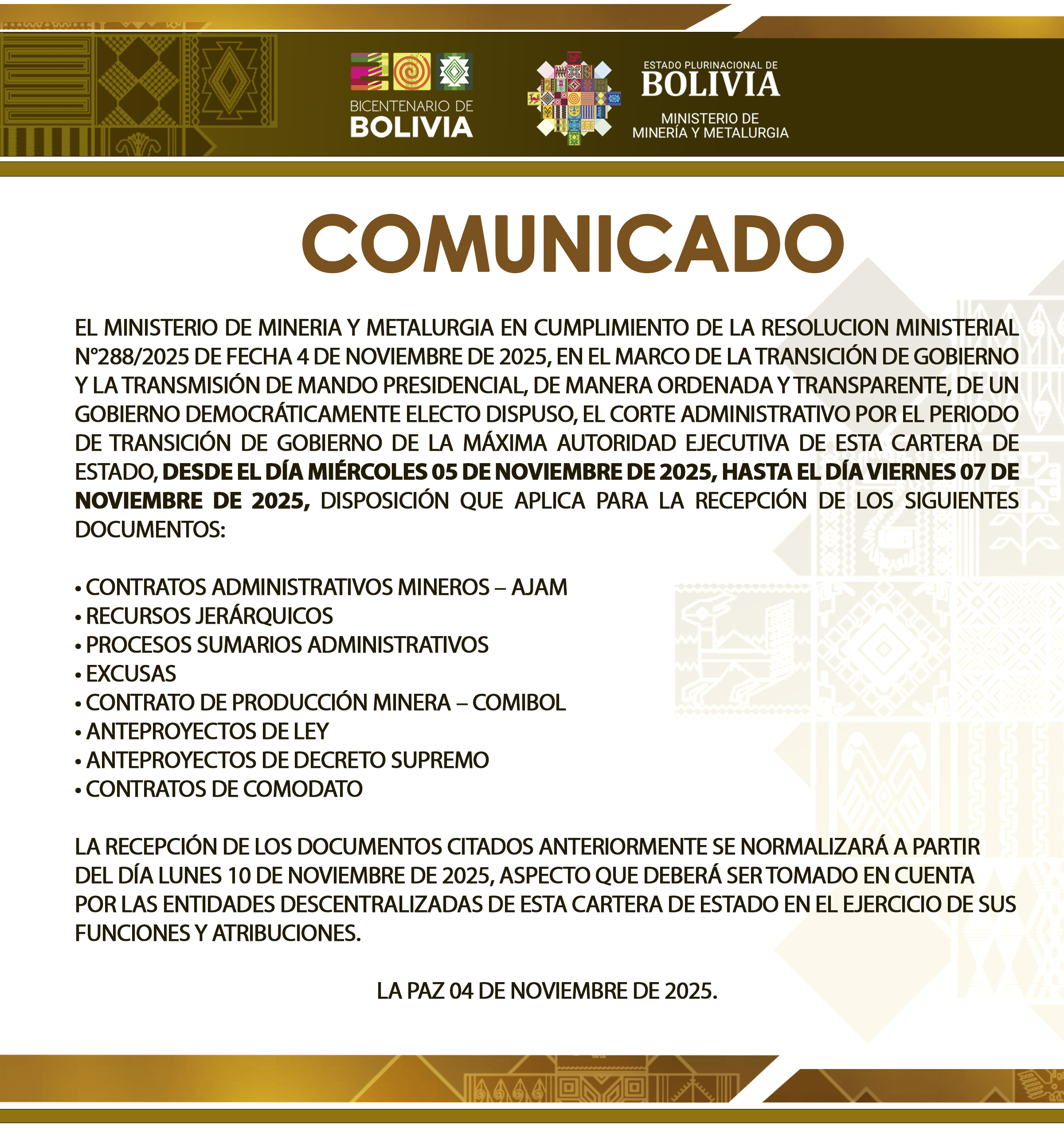 | La Paz, 25 de noviembre de 2025.- El Ministro de Minería y Metalurgia, Ing. Marco Antonio Calderón de la Barca Quintanilla, tomó juramento al Dr. Jaime José Sanabria Goytia como el nuevo Director Ejecutivo Nacional de la Autoridad Jurisdiccional Administrativa Minera (AJAM), en cumplimiento a la... |