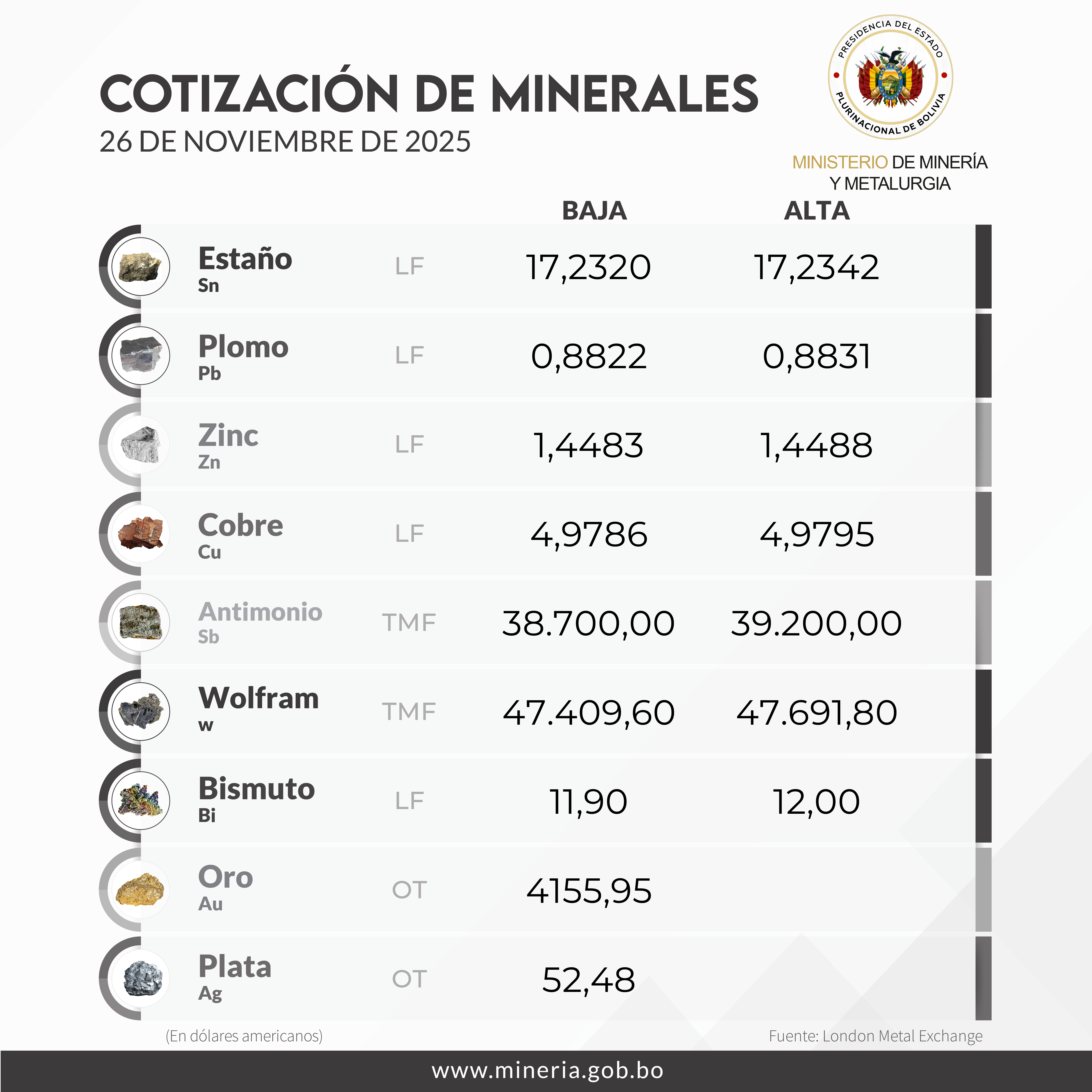 La Paz, 19 de noviembre de 2025. – El Ministro de Minería y Metalurgia, Ing. Marco Antonio Calderón de la Barca Quintanilla, recibió la tarde de este miércoles en su despacho a la directiva de la Federación Regional de Cooperativas Mineras Auríferas (FERRECO), encabezada por su presidente de... |  |