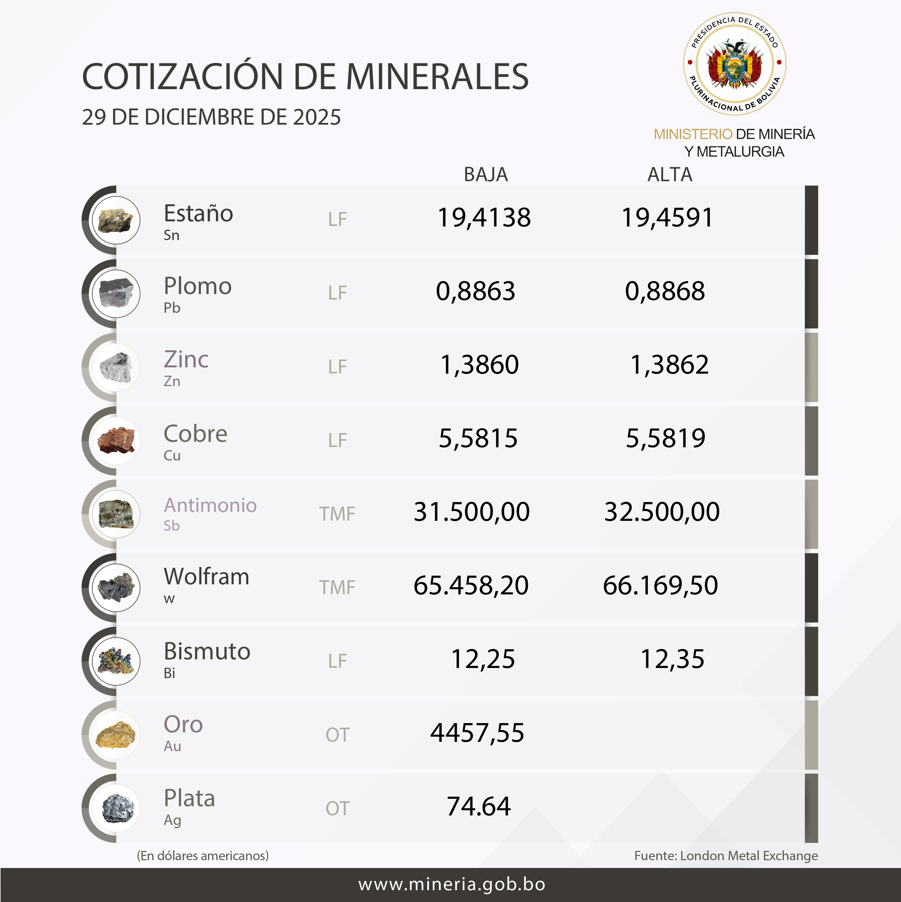 | La Paz, 19 de diciembre de 2025. – El Gobierno del Estado Plurinacional de Bolivia, a través del Ministerio de Minería y Metalurgia, anunció la ampliación por 18 meses de los contratos administrativos mineros, en el marco del Plan de Formalización Cooperativa Minera, una medida orientada a co... |